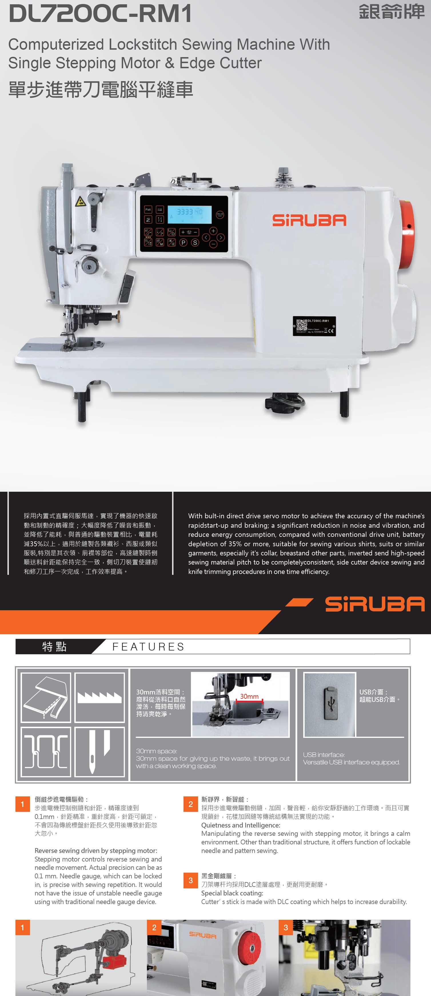 採用內置式直驅伺服馬達,實現了機器的快速啟動和制動的精確度;大幅度降低了噪音和振動,並降低了能耗,與普通的驅動裝置相比,電量耗減35% 以上,適用於縫製各類襯衫、西服或類似服裝, 特別是其衣領、前襟等部位, 高速縫製時倒順送料針距能保持完全一致,側切刀裝置使縫紉和修刀工序一次完成,工作效率提高。