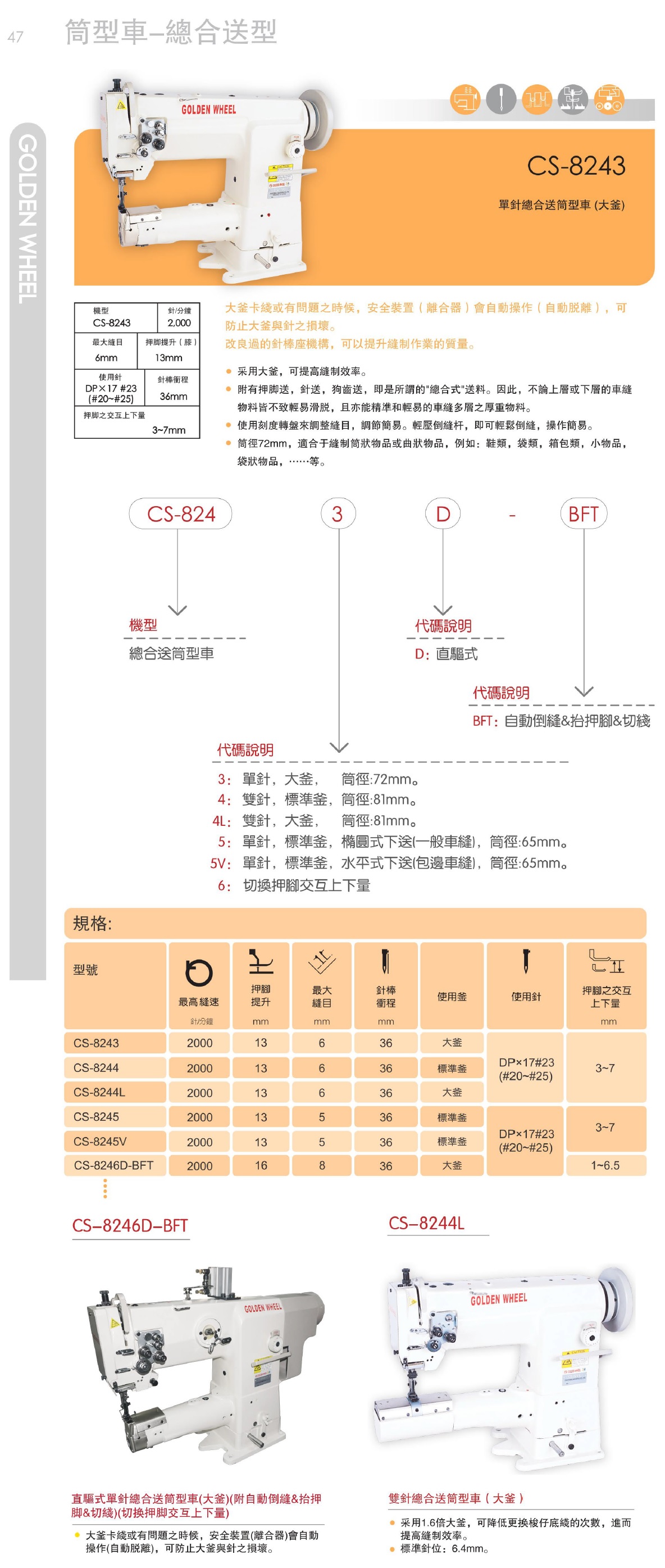 金輪牌 GOLDEN-WHEEL CS-8243 單針總合送筒型車 (大釜)